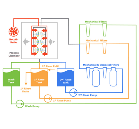 - Multiple configurations (2 cycle wash – rinse or 3 cycle wash – pre-rinse – final rinse)